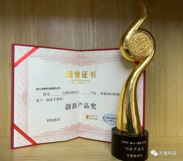 在頒獎典禮上,我公司《雲隙光窗台燈》榮獲第十一屆金手指獎-創新産品獎